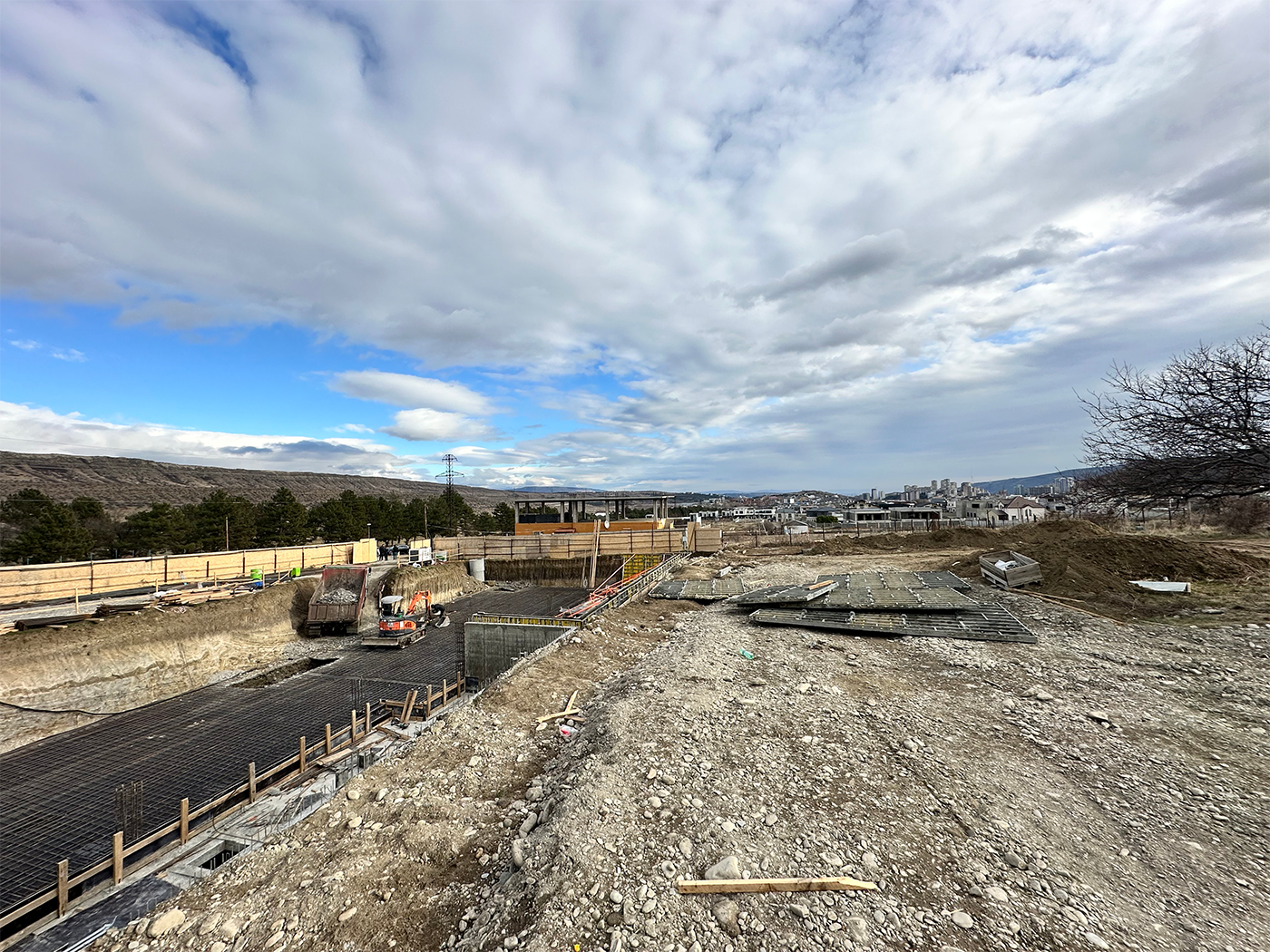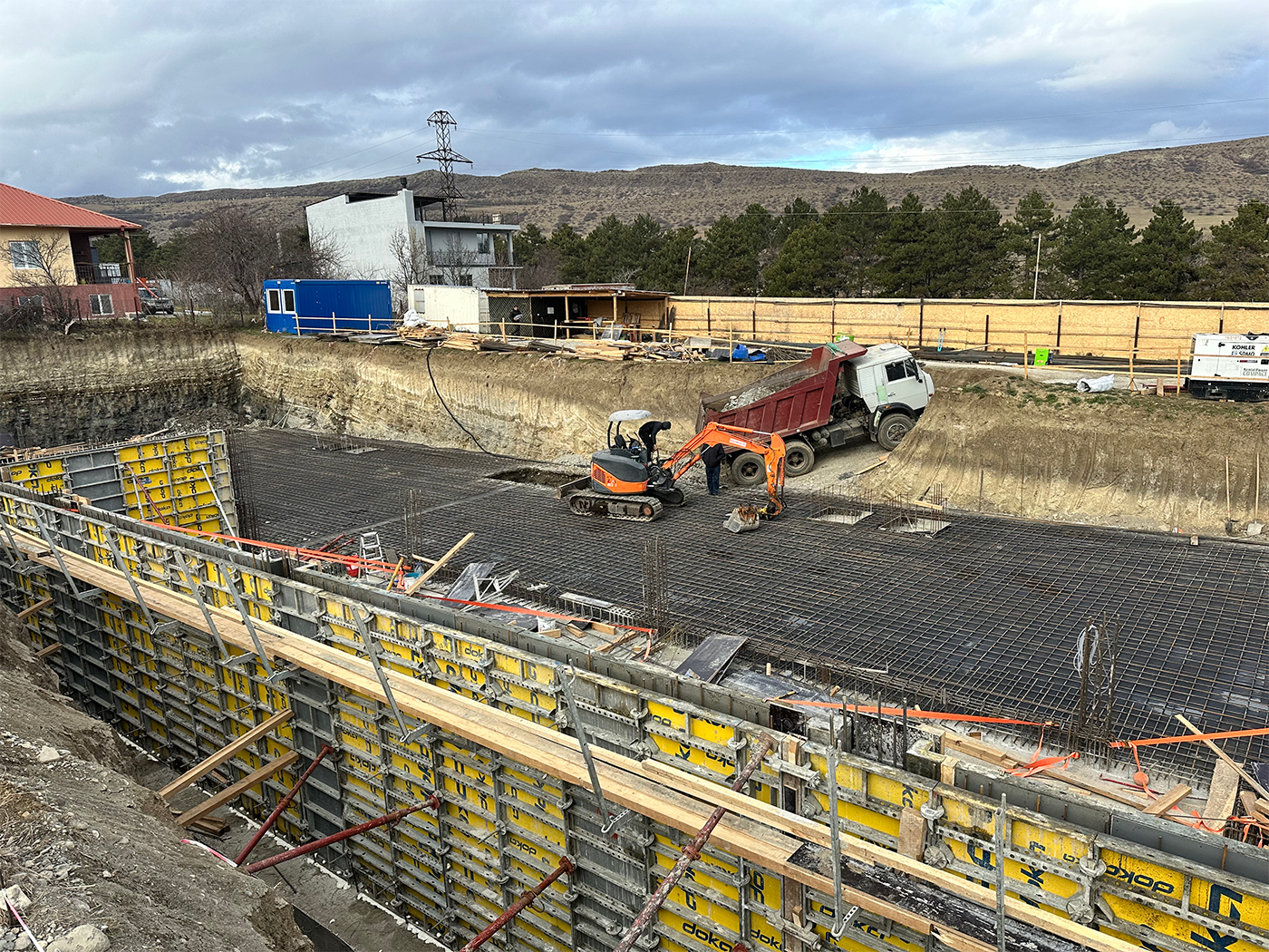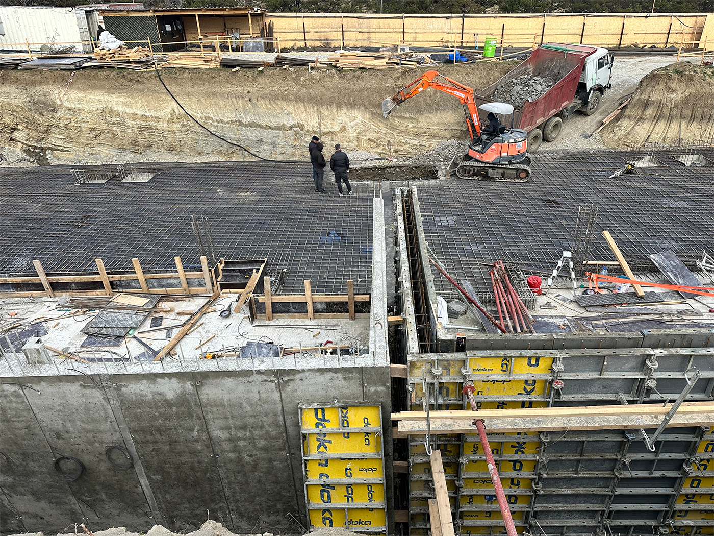 კომპლექსის მშენებლობა გადამწყვეტ ფაზაში შევიდა — საძირკვლის ჩასხმის სამუშაოები წარმატებით დასრულდა. ეს ნიშნავს, რომ პროექტის ყველაზე შრომატევადი და საინჟინრო თვალსაზრისით საპასუხისმგებლო ნაწილი შესრულებულია. ადგილზე უკვე მკაფიოდ იკვეთება ნაგებობის რთული და საინტერესო კონტურები, რომლებიც ნაკვეთის 3-მეტრიან ქანობსა და ბუნებრივ რელიეფს მიჰყვება. სწორედ ეს მრავალდონიანი საფუძველი გახდება გარანტი იმ გამორჩეული არქიტექტურისა, რომელიც ტერასულ განაშენიანებასა და სივრცეების ფუნქციურ განაწილებას ითვალისწინებს.